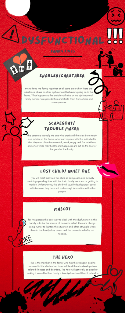 All of these are just some of the examples of ways a dysfunctional family can be formed, and the chaotic environment ends up leading the children stuck in them to develop unhealthy characteristics. There are five dysfunctional family roles that children tend to take on. I think maybe it is possible to develop into more than one of the roles within one child, because as I was going through them, I felt I grew up in multiple ones.