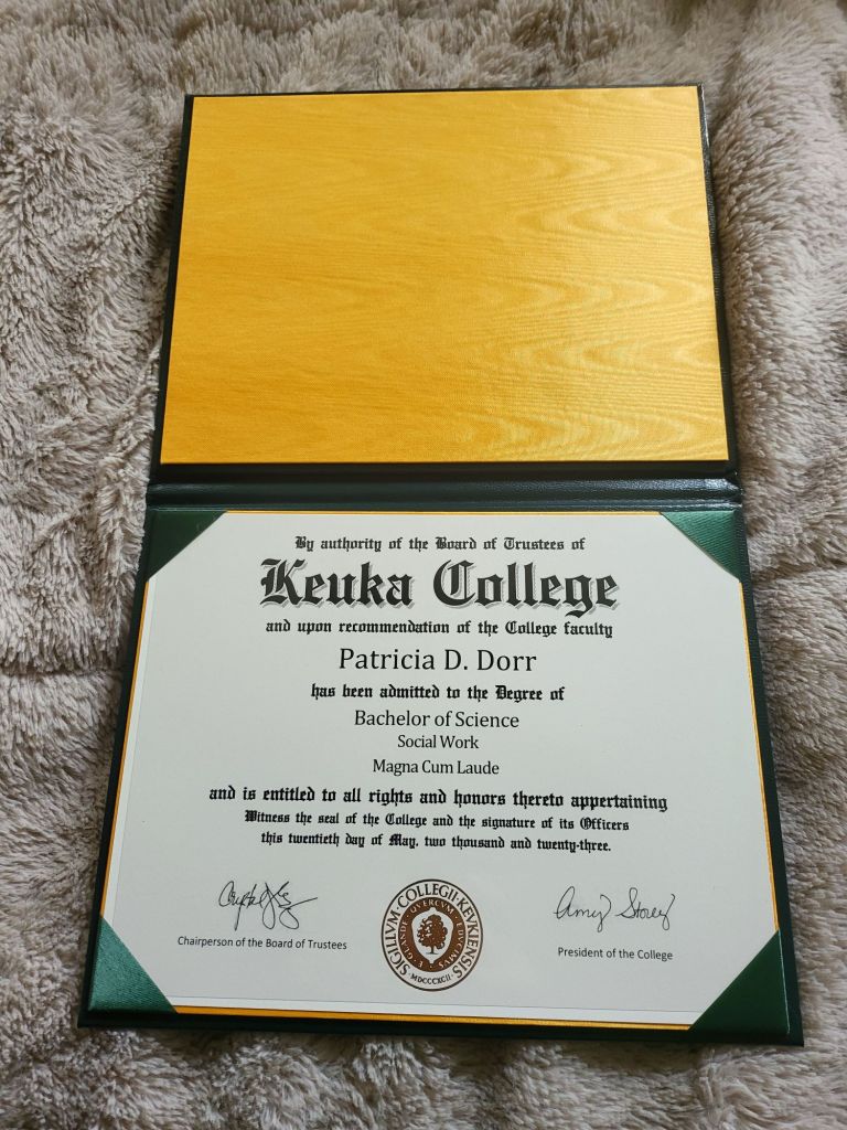 Here I earned my Bachelor’s in Social Work (BSW) Magna Cum Laude, which is just a fancy way of saying I was stressed to the max for about 2 years trying to do my best managing school and life. I attended this college totally online and although it would have been distant learning and I love hybrid at a closer near by school if not for covid, I am actually glad it was all online because traveling in winter is really hard for me even in my town I live in due to the fact that I can’t drive.