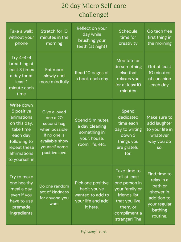 Many people think that self care has to involve money with things like a spa day, or mani pedis but it doesn’t have to. Self-care is anything you do to take care of some aspect of yourself being physical, mental, social, or spiritual.