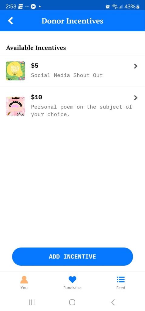 For now, my fundraising goal is $250, but if I get a lot of support, I will up the goal to $500. So far, there are incentives for donating 5 dollars and 10 dollars. Every 5 dollar donation gets you social media shout outs on the platforms of your choice, and every 10 dollar donation gets you a personalized poem on the subject of your choice. I am still trying to think of incentives for larger donations and am taking suggestions.
