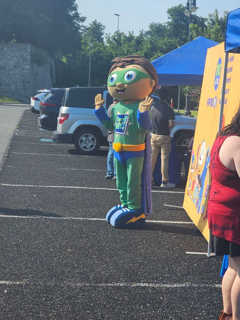 I spent about an hour at the actual block party listening to some really good live music, making a couple of friends, checking out the vendors, and checking out the community organizations. P.B.S. was one of the organizations, so I took a picture of the mascot they had there from the pre-school show Super Why.
